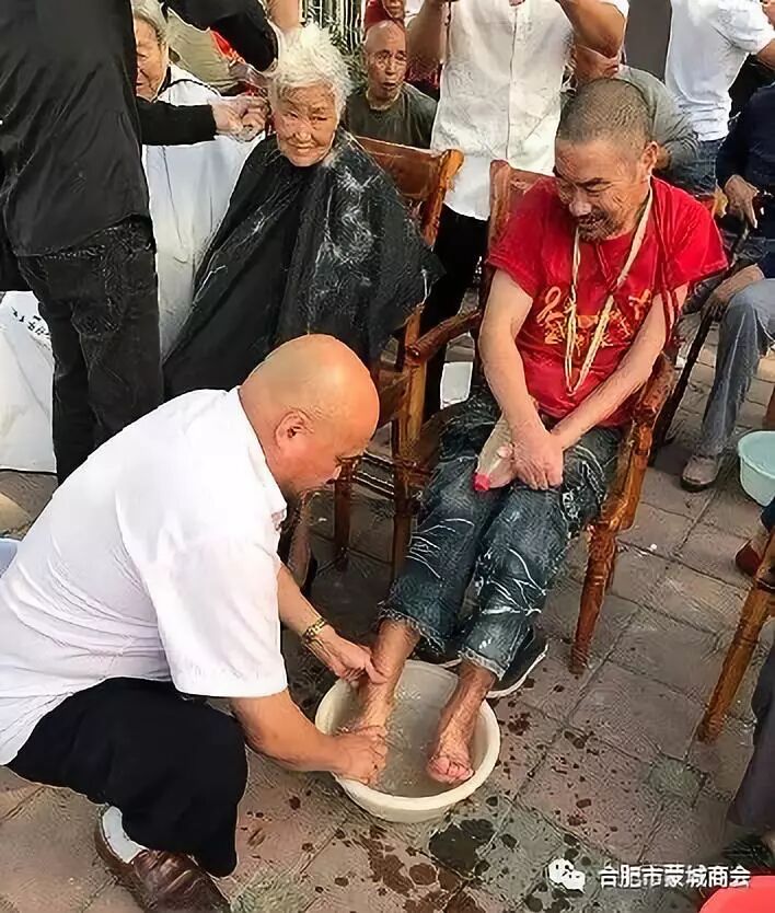本网讯:2019年9月26日上午,受合肥市蒙城商会会长李朋民的委托,合肥市蒙城商会副会长李殿忠、陶春才、副秘书长刘阔、会员葛绍本等,在蒙城县工商联主席张明生的带领下,联合蒙城县美容美发协会举行爱老、敬老活动,走进蒙城县庄周养老院,为老人们送去米、面、油、奶粉等生活必需品,并义务给老人们理发、洗脚、剪指甲、打扫卫生、叠被子。